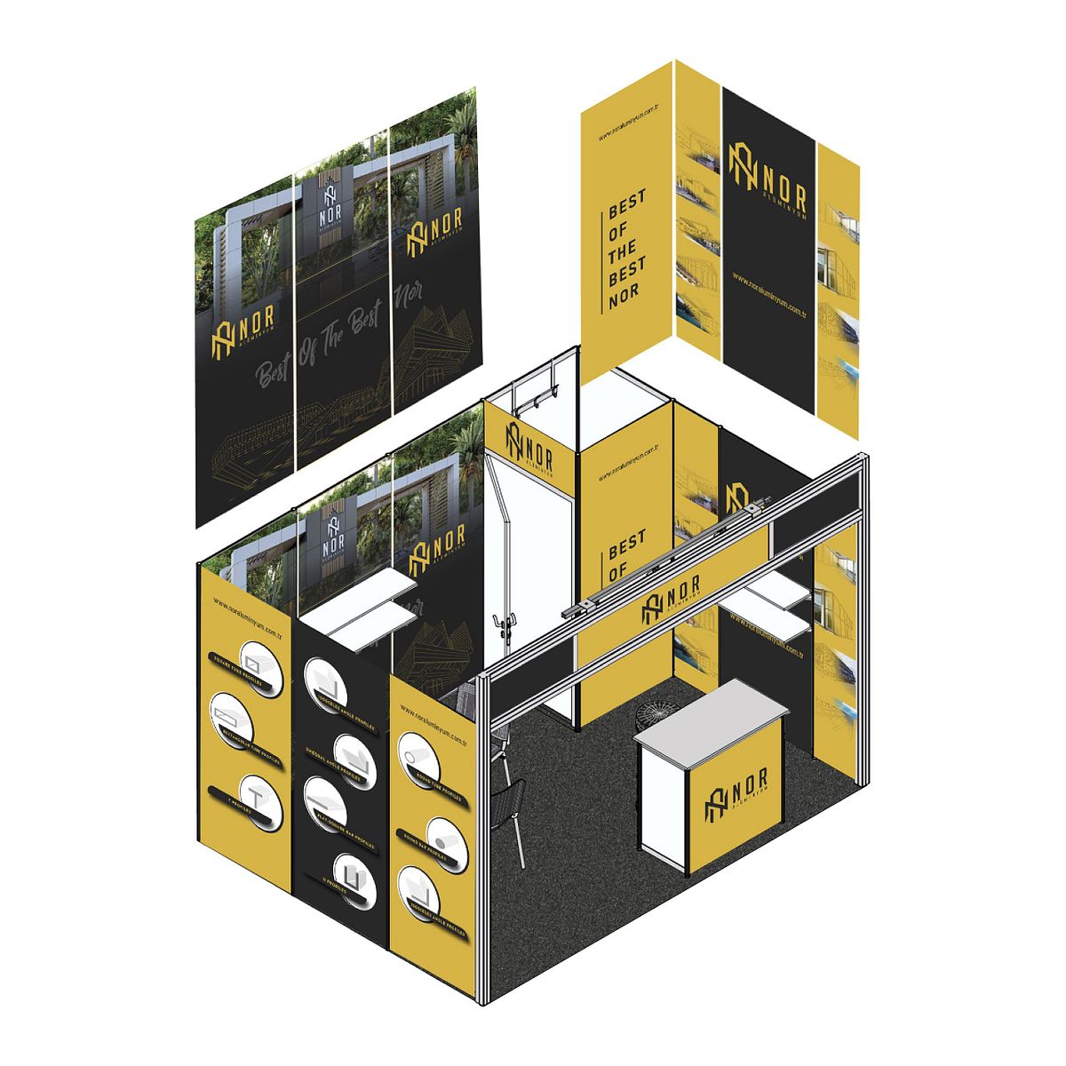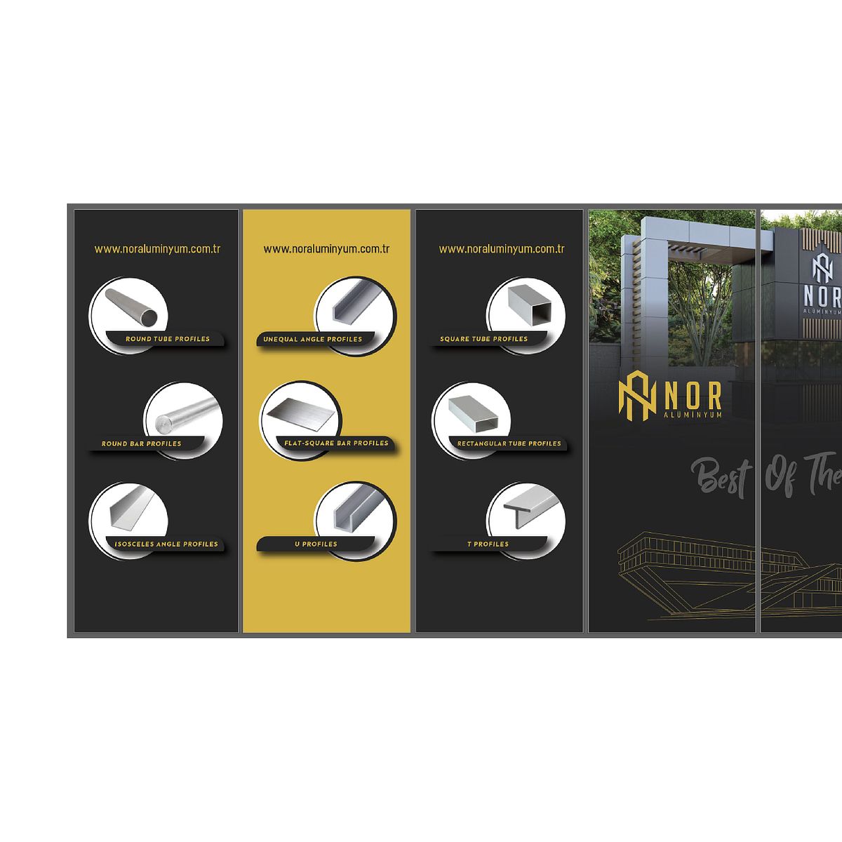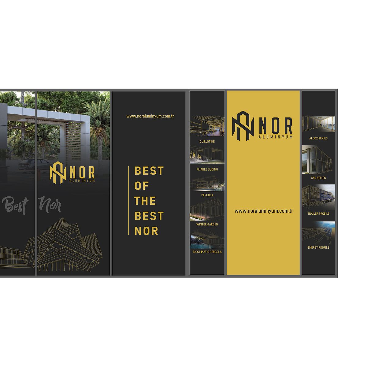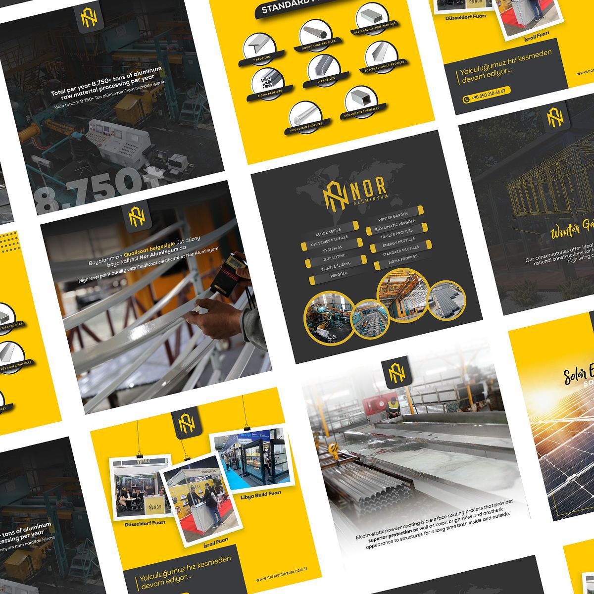 NOR Aluminium ist eine Marke, die professionelle Lösungen im Produktions- und Anwendungsbereich anbietet. Ziel war es, eine starke visuelle Identität zu entwickeln, die technische Kompetenz und Zuverlässigkeit klar kommuniziert und über verschiedene Medien hinweg konsistent funktioniert. Das Designsystem wurde so aufgebaut, dass es in Print-, Digital- und räumlichen Anwendungen eine klare Lesbarkeit und hohe Sichtbarkeit gewährleistet.